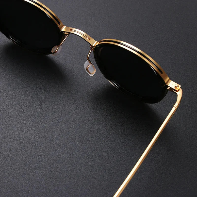 A study in architectural balance, the round lenses are housed in a polished alloy chassis with contrasting temple arms for subtle visual intrigue. Ultra-light and pressure-free, they offer all-day comfort with unapologetic style.