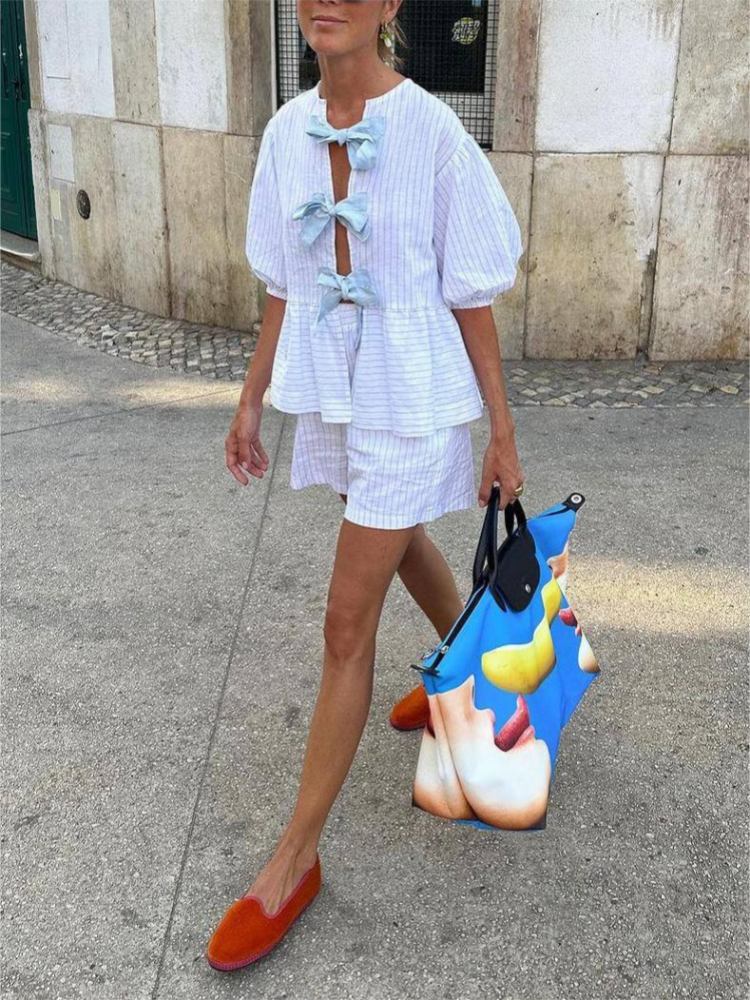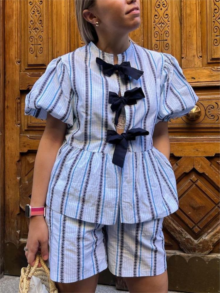 Glamorous striped tie top short set. This set features trendy puff sleeves and a classic stripe pattern, get ready to turn heads in this playful cornflower blue & pink vertical-stripe tie-front smock-top!