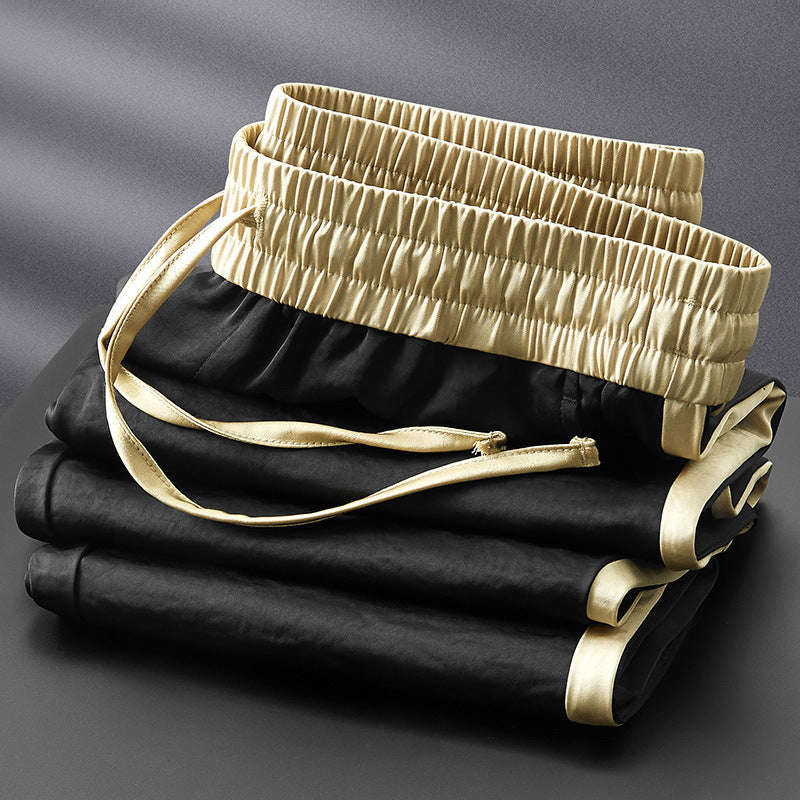 An homage to old-world sport aesthetics, reimagined in pure silk. These pants feature a soft-yet-structured fall and contrast tonal bands that elongate the leg. Pair them with nothing or everything—either way, they speak before you do.